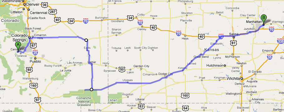 Here is the route from Cañon City, Colorado to Manhattan, KS – The Most Direct Way, Right??? More on that later…