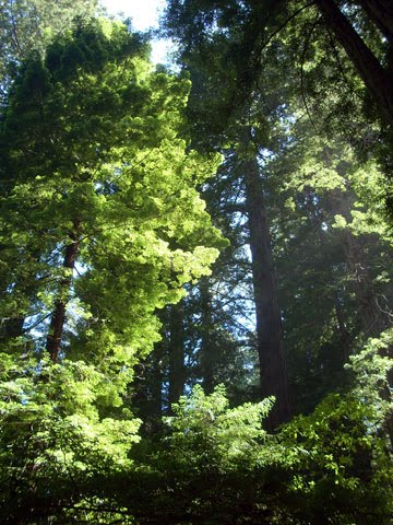 A shot upwards into the leaves shows their evergreens grabbing the sunight a hundred feet up.