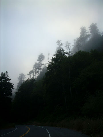 In the fog and along the sheer cliffs I started to get a little delerious from driving. I think I was pushing a little too hard. Mind boggled from the day, I passed up some over-crowded campsites on the beach. Saw a bunch of No Vacancy signs in Fort Bragg and then found myself without lodging at all. I knew this point would come in the trip. I was slightly disspointed in myself… but needed to buck up and get through. I found a beachfront parking lot that allowed overnighters, tried to sleep in back with Rox, ended up in a sleeping bag in the driver’s seat. When Ranger Rick came by and wanted some money, I gave it.